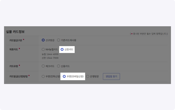 제휴카드 : 신한카드 / 우편(모바일신청) 선택